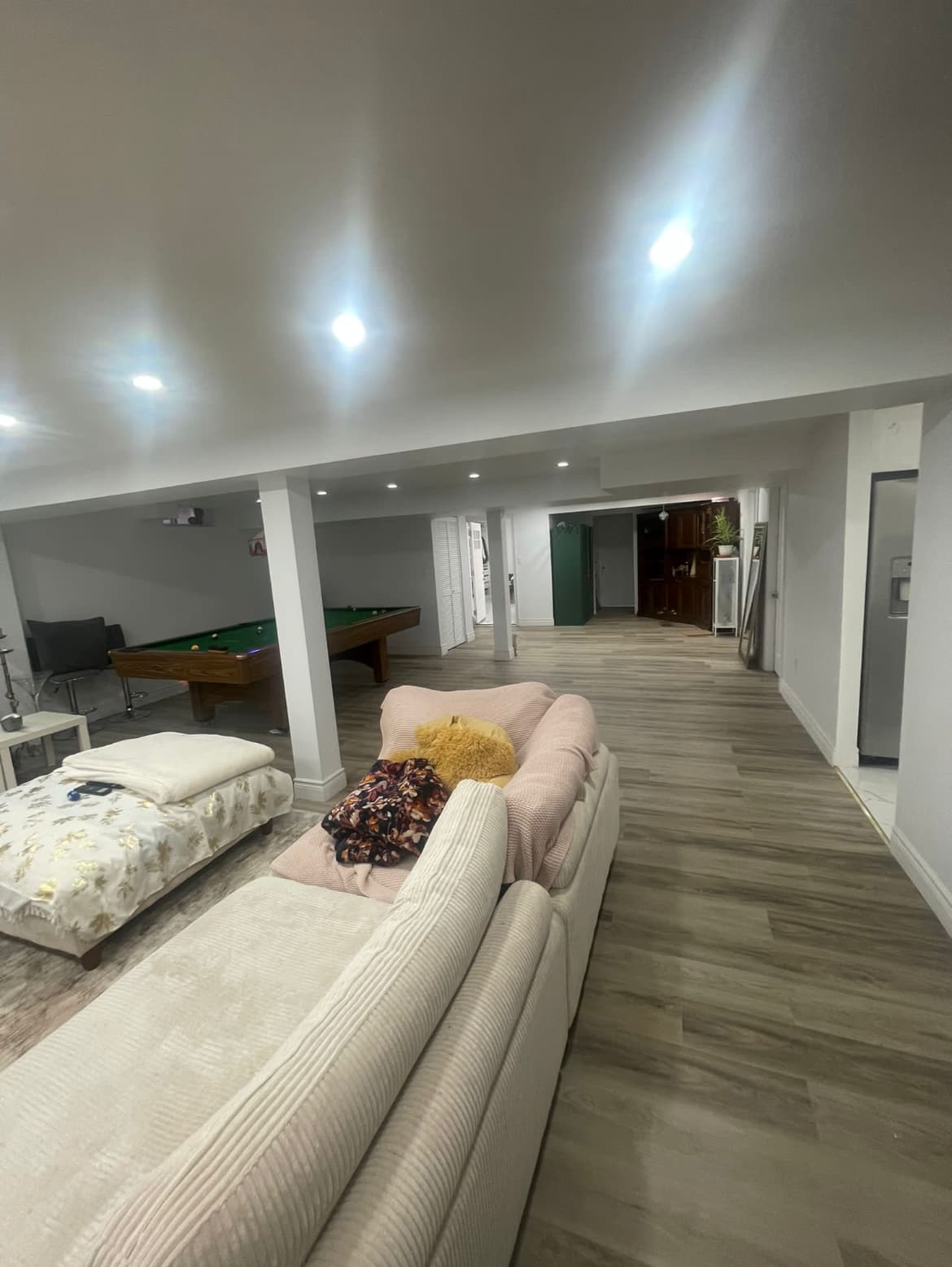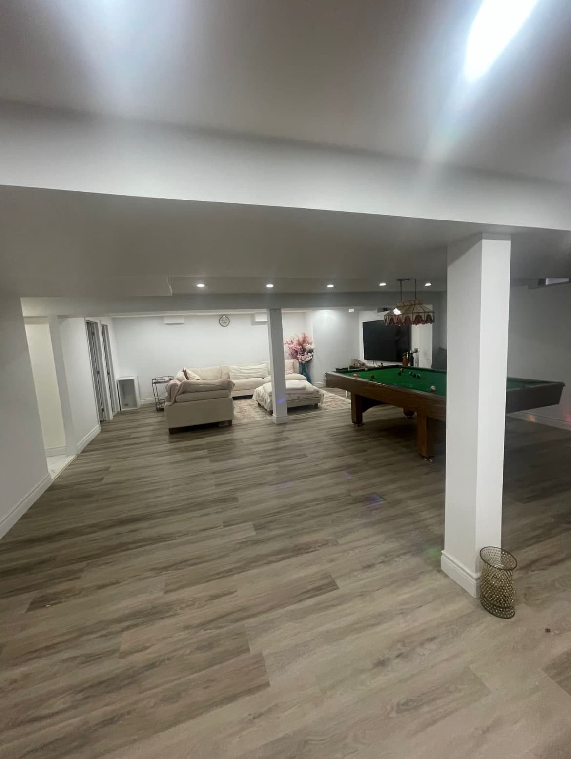 Complete basement finishing including framing, drywall, flooring, electrical, and plumbing.